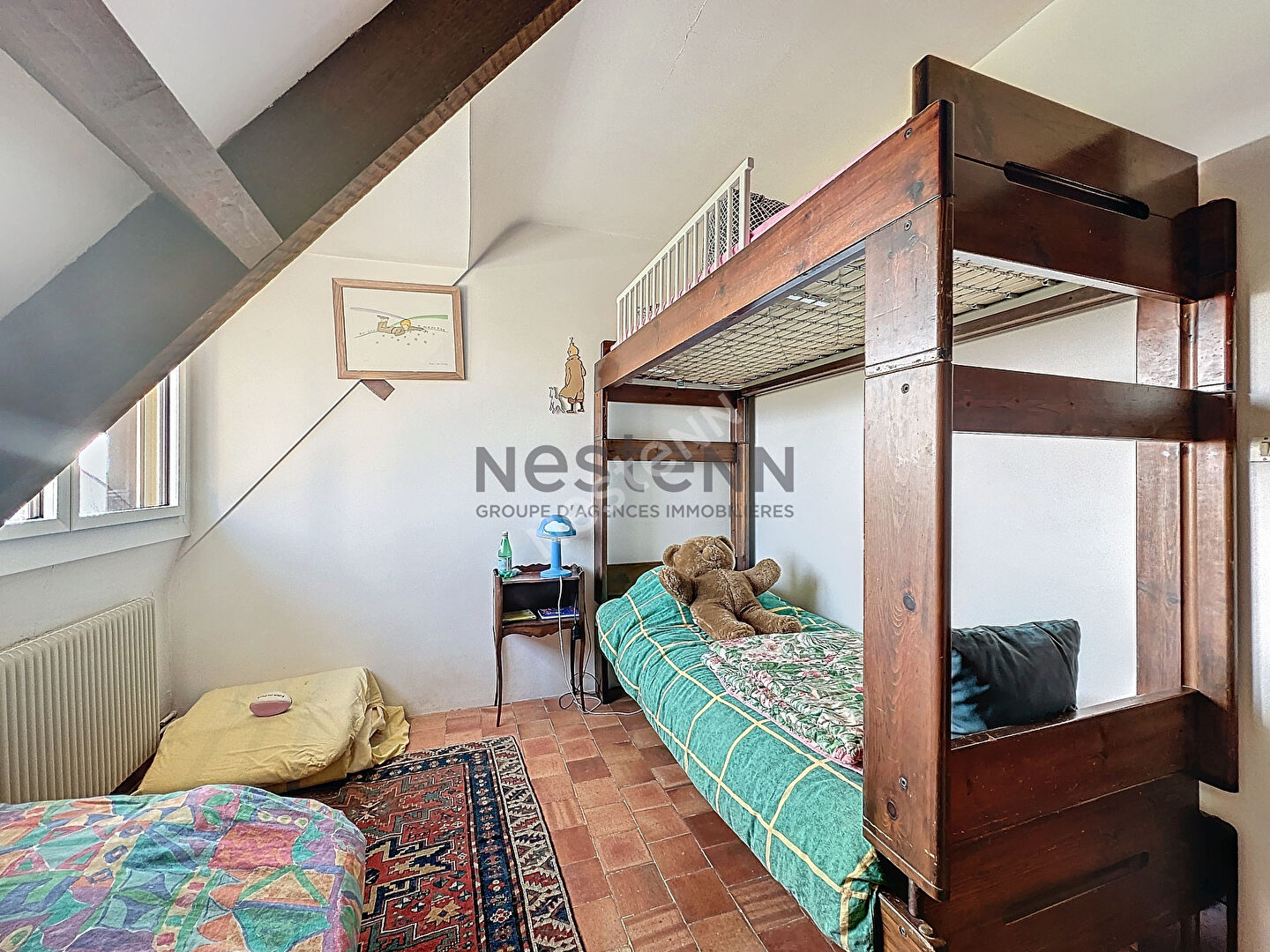 A l'étage vous trouverez quatre belle chambres, un WC indépendant, deux salles de bains et une magnifique mezzanine pouvant faire office de bureau avec une vue surplombant la pièce de vie.